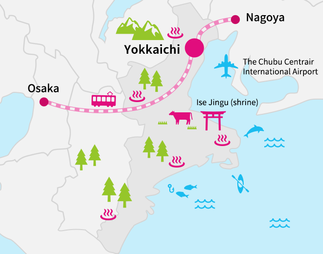 Yokkaichi City is about 30 minutes from Nagoya and about 120 minutes to Osaka by train. Kyoto can be reached in about 80 minutes by car from the city, and is easily accessible to the surrounding area. In addition, the Chubu Centrair International Airport is located approximately 60 minutes by bus from the city, making your travel by airplane easy and convenient.