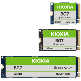 KIOXIA BG7 Series is a line-up of compact form factor NVMe™ SSDs that feature capacities up to 2,048 GB, and leverages a PCIe® Gen4 x4 interface and BiCS FLASH™ generation 8, suitable for thin, light and performance-oriented systems such as ultra-thin PCs and AI PCs.