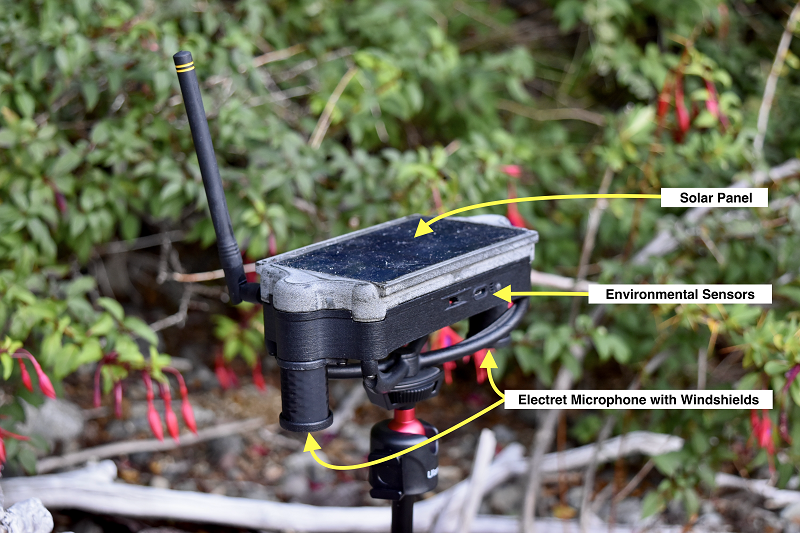 BuzzCam is an outdoor acoustic device equipped with a microphone, battery, solar panel, and KIOXIA micro SD memory cards for stotage, designed to operate for extended periods even under harsh field conditions such as rain or direct sunlight.
