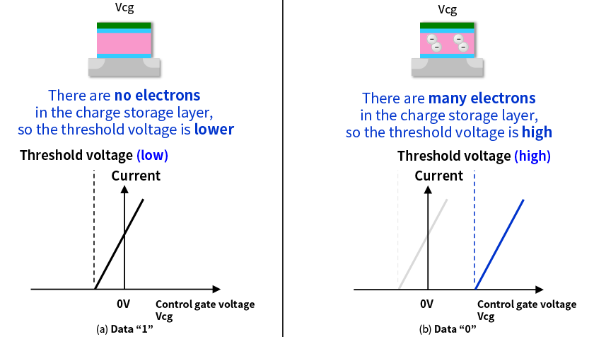 The lower the number of electrons in the charge storage film is, the easier it is for current to flow. For this reason, in the memory cell in Figure 1(a), the threshold voltage is lower because there are no electrons in the charge storage film. On the other hand, in the memory cell in (b), the threshold voltage is higher because there are many electrons in the charge storage film.