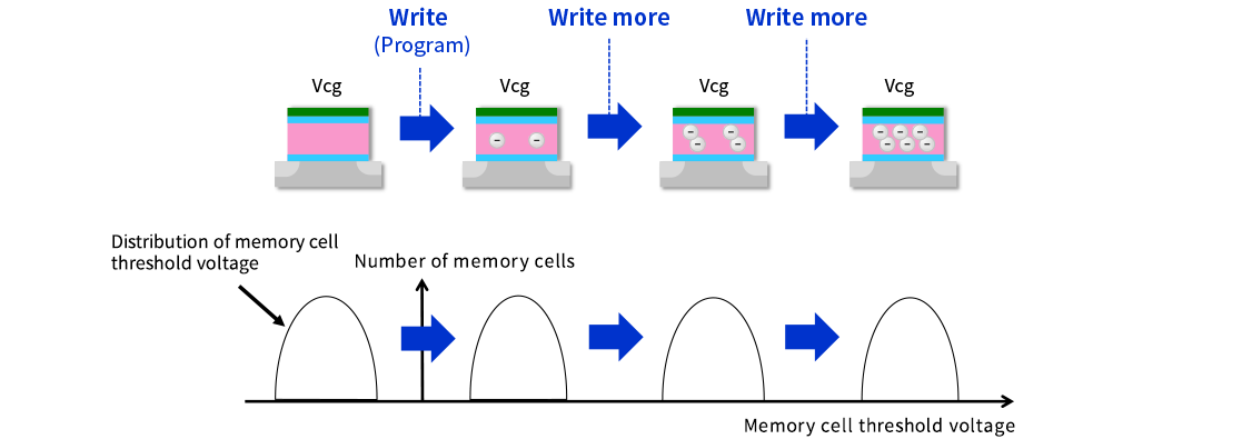 In flash memory, a write operation can change the threshold voltage of a memory cell. As shown in Figure 3, as the write operation is repeated, the number of electrons in the charge storage film in the memory cell increases and the threshold voltage increases.