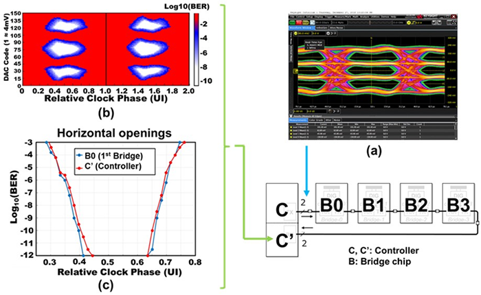 Figure 3(a) shows PAM4 signal output from the controller C measured by an oscilloscope, and a good PAM4 waveform is observed. This PAM4 signal is received by the final controller C’ via four bridge chips B0 – B3. Figure 3(b) shows an eye diagram*7 observed utilizing on-chip eye monitor on the final controller C’ and clear three eye openings for each cycle waveform are obtained. Figure 3(c) shows measured bit error rate (BER) of the bridge chip B0 and final controller C’, and sufficiently low BER less than 10-12 is obtained for both cases. By similar measurements for all chips in the daisy chain, we confirmed 25.6-Gbps PAM4 communications with sufficient performance for all bridge chips and controllers.