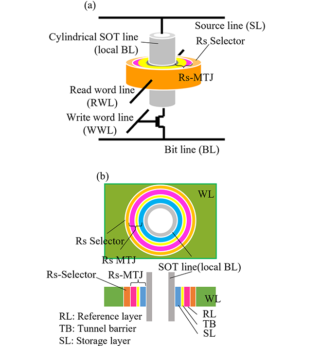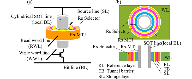 To address them, we propose a new magnetically stable cell architecture with a ring-shaped magnetic tunneling junction (Rs-MTJ) as illustrated in Figure 1. The SOT-MRAM cell basically consists of an Rs-MTJ, an Rs-selector, a write transistor and a vertical SOT line with a cylindrical structure. Owing to the formation of a closed magnetic circuit within the Rs-MTJ, it is expected to enhance magnetic stability in the static storage state and improve magnetic immunity.