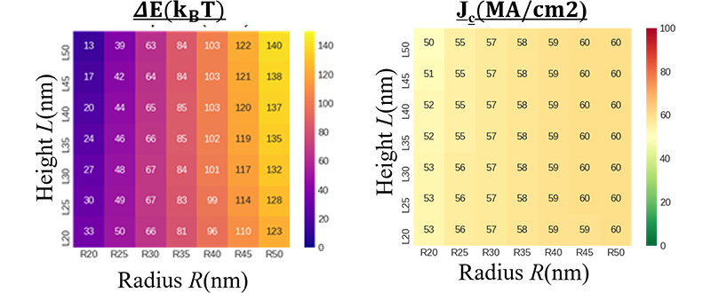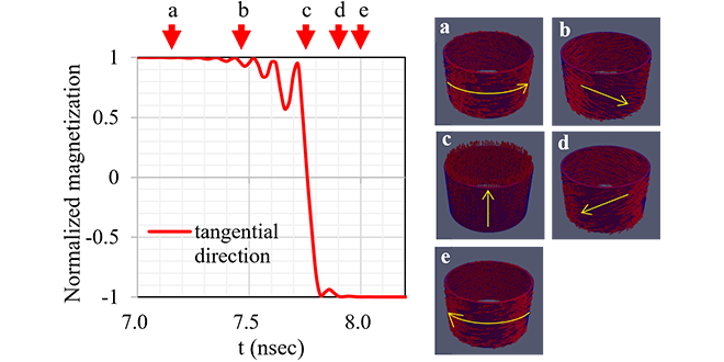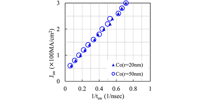The SOT switching behavior in the Rs-MTJ has not been thoroughly explored so far. To clarify this, we investigate it using the micro-magnetic simulation. Our analysis of the SOT switching of the ring-shaped storage layer (Rs-SL) reveals stable coherent SOT magnetization reversal utilizing the practical MTJ material, such as cobalt, seen in Figure 2. Furthermore, we demonstrate that the SOT switching current density (Jsw) is inversely proportional to the SOT switching time (tsw) as shown in Figure 3. It indicates that the SOT switching behavior of the Rs-MTJ is described by the macro-spin model.