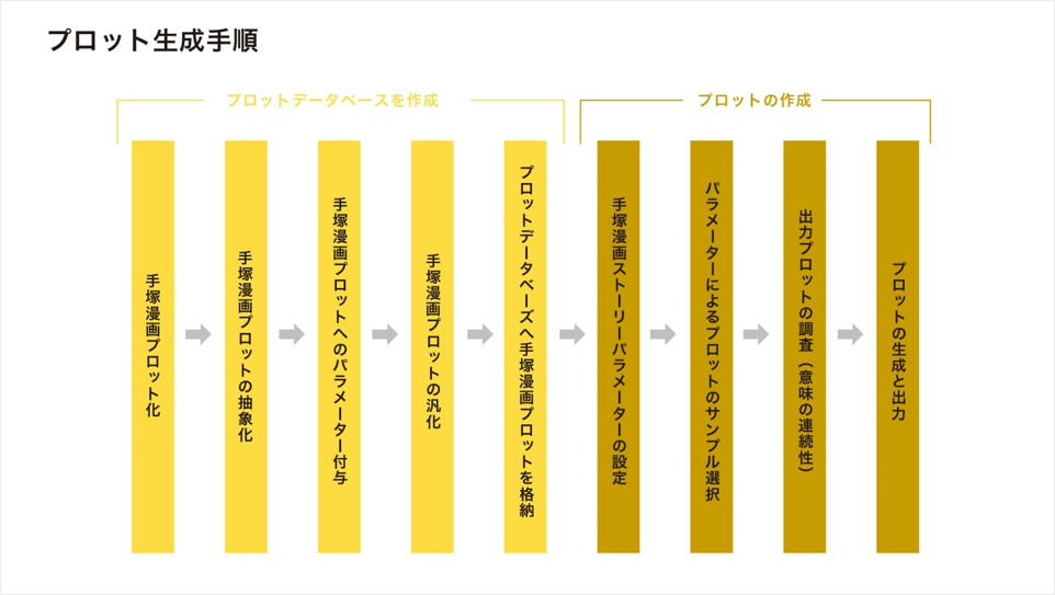 1話完結型の手塚作品130作のストーリーを13のフェイズに分解したプロットデータを用意し、AIに作家性と作品性を学習させ、AI自らストーリーの骨子となる「プロット」を生成しました(図1)。試行を経て生成した100を超えるプロットの中には、普通の人では思いつかないような意外性のある内容もあり、プロジェクトメンバーによる議論を経て、「ぱいどん」に採用されたプロットが選ばれました。