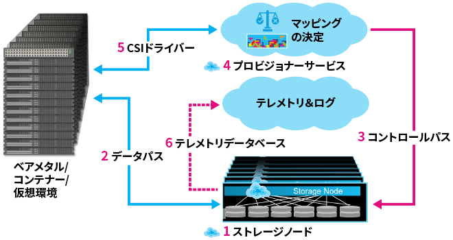 指示、設定に基づいて最適なストレージ領域をストレージノードから切り出し、QoSを管理