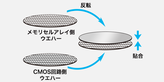 そこで提案されたのがCBA構造です。CBA構造では、CMOSとセルアレイを別々のSiウエハー上に形成した後、それぞれのウエハー上に銅(Cu)ボンディングパッドを形成します。その後、図1に示すようにSiウエハー同士をCuダイレクトボンディングプロセスで貼り合わせ、Cuボンディングパッドを介して、CMOSとセルアレイを電気的に接続することで3次元フラッシュメモリを形成します。この結果、CMOSをセルアレイと重ね合わせて形成することでチップサイズを縮小しつつ、CMOSとセルアレイはそれぞれ最適な熱プロセスを行うことが可能となり、性能向上も実現できます。