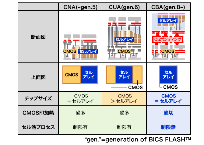 3次元フラッシュメモリのコスト削減の一つの施策は、チップサイズを小さくして300mmウエハーからより多くのチップを取得することです。そこで、BiCS FLASH™ gen. 6ではCMOSをセルアレイの下に形成するCMOS Under Array(CUA)構造が導入されました。CUA構造はCMOSを形成後、その上にセルアレイを連続的に1枚のSiウエハー上に形成するため、CNAと比較してチップサイズを縮小できます。一方で、CNAと同様にCMOSやセルアレイ形成時の温度は制限されるため、セルとCMOSの性能向上がトレードオフとなり、両立することが困難です。