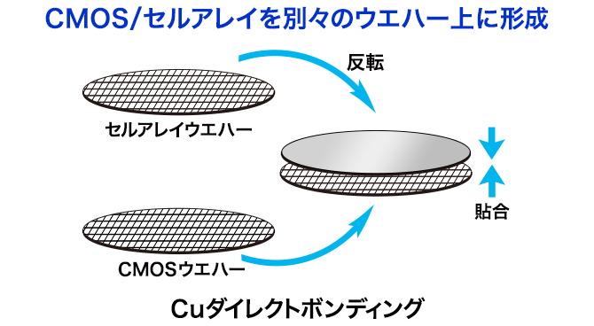 この複雑な形状を持つセルアレイウエハーとほぼ反りが無いCMOSウエハーを、前述のように数百 nm以下のズレで貼り合わせています。これは例えるなら、ゴルフで200ヤード飛ばしたボールをピンからほんの数ミリもずれない位置に何度も落とすくらいの非常に微細なズレということになります。ここでもCBA構造は非常に高いCuダイレクトボンディングプロセス制御性を実現していることが分かります。