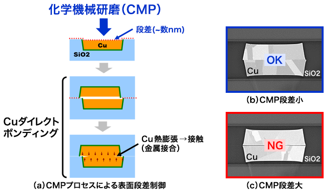 この極微小な段差を制御するのが化学機械研磨(chemical mechanical polishing: CMP)プロセスです。300 mmウエハーの表面をCMPで研磨し、数 nmレベルの段差に仕上げることは、例えるなら東京ドームの中でコピー用紙1枚ほどの段差以下にするような精度のモフォロジー制御が求められます。この数nmレベルの表面段差に制御されたCMOSおよびセルアレイを有する300 mmウエハー同士を向かい合わせてSiO2層間膜表面を貼り合わせた後、アニールによりCuを熱膨張させることでCu同士が金属結合し、電気的に接続可能となります。段差が小さい場合は図2(b)のように上下のボンディングパッドのCu同士が隙間なく接続しています。一方、段差が大きいと図2(c)のように上下ボンディングパッドのCu間に隙間が生じ、電気的接続ができません。CMOSとセルアレイの間は百万個以上のCuボンディングパッドで接続する必要があるため、CBA構造では非常に高いCMPプロセス制御性を実現していることが分かります。