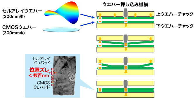 もう一つは、Cuダイレクトボンディングプロセスにおける上下ウエハー間の位置合わせ技術です。図3にCuダイレクトボンディングプロセスのシーケンスを示します。CuダイレクトボンディングプロセスではCMOSウエハーとセルアレイウエハーの表面を向かい合わせ、ウエハーの中央部から外周部に向けて徐々に近づけながら貼り合わせます。この際、300 mmウエハーの中央部から最外周部まで、CMOSとセルアレイを電気的に接続するためには、ウエハーの位置を数百 nm以下のズレに制御する必要があります。さらに、3次元フラッシュメモリのセルアレイウエハーは表1の図に示すように多数のメモリセルやワードラインが存在し、非常に大きく複雑な応力がかかっています。その結果、図3に示すように、セルアレイウエハーはポテトチップスのような複雑な反り形状になります。