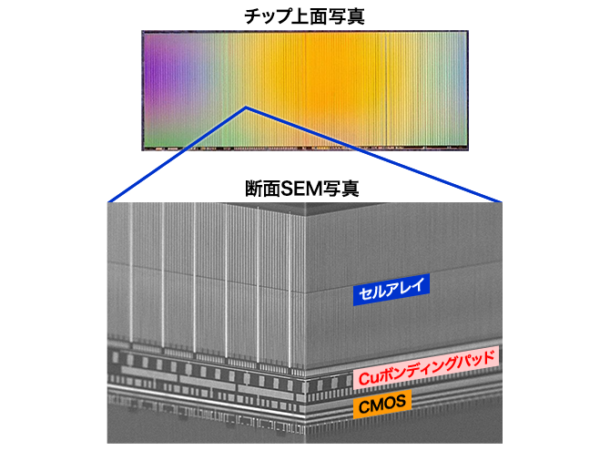 このように非常に高度なプロセス制御性を実現することにより、CBA構造はBiCS FLASH™ gen. 8で製品化されました。図4はチップの上面写真と断面SEM写真であり、CMOSとセルアレイが多数のCuボンディングパッドで接続されている様子が確認できます。このようにCMOSとセルアレイを別々に形成し、Cuボンディングパッドを介して貼り合わせることにより、セル電流は前世代比35%の向上、インターフェース速度は3.6 Gbpsの性能向上を達成しました[1][2]。