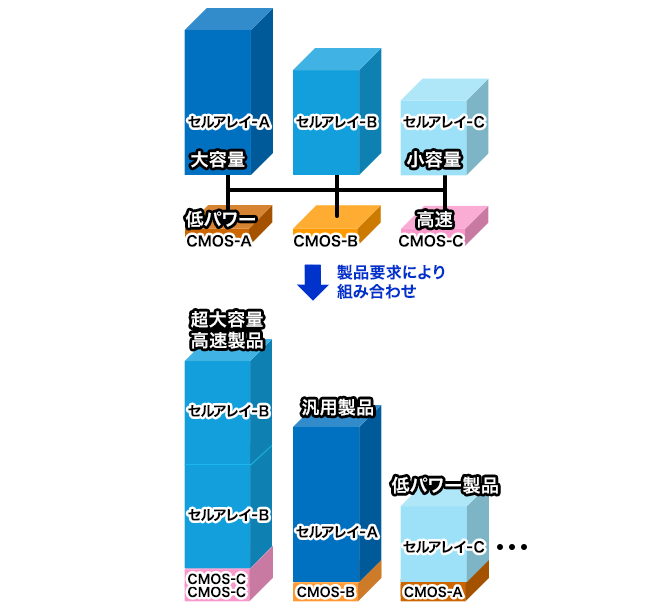 さらに、3次元フラッシュメモリの将来に向けた多様な製品要求の実現において、CBA構造は非常に有効です。図5はBiCS FLASH™ gen. 9以降の将来のCBA構造イメージを示しています。異なる性能を持つCMOSと異なる容量を持つセルアレイを組み合わせることにより、IoT、AI、ビッグデータなどの進化を支える3次元フラッシュメモリの実現が可能となります。