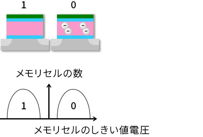 電荷蓄積膜の中の電子の数が少ない方が電流は流れやすくなります。このため、図1の(a)のメモリセルでは、電荷蓄積膜の中に電子が無いため、しきい値電圧が低くなります。一方、(b)のメモリセルでは、電荷蓄積膜の中に多くの電子があるため、しきい値電圧が高くなります。