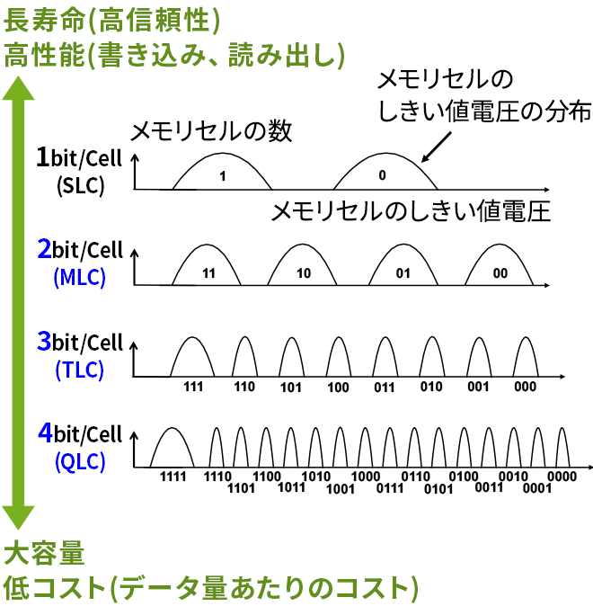 SLC:Single Level Cell, MLC:Multi Level Cell, TLC:Triple Level Cell, QLC:Quad Level Cell