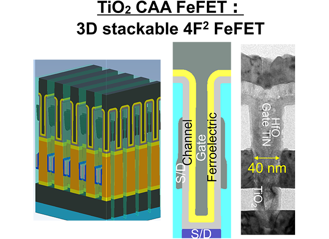 私たちは、次世代の高速大容量メモリの候補として、縦型チャネルオールアラウンド型のTiO2チャネル強誘電体トランジスタ(TiO2 CAA FeFET)の開発を進めています 図1 [1]。高速メモリには高い駆動電流が必要です。本研究では、TiO2 CAA FeFETの駆動電流改善に向けて、寄生抵抗発現メカニズムを詳細に調査し、改善指針を構築しました。