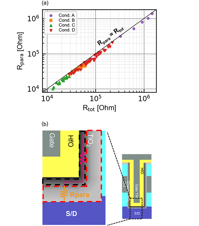 図2(a)には、詳細な電気特性評価により抽出したTiO2 CAA FeFETの寄生抵抗成分(Rpara)と素子の総抵抗(Rtot)の関係を示します。総抵抗のおよそ85%が寄生抵抗成分であり、比率は素子構造や形成プロセスに依存せずほぼ一定であることが分かりました。このことから、TiO2 CAA FeFETの寄生抵抗成分は一般的なトランジスタの寄生抵抗とは異なり、蓄積していないチャネル領域が主成分であることを提案しました 図2(b)。