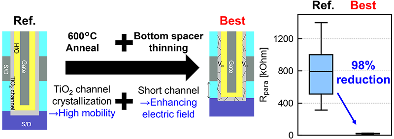 チャネル領域が寄生抵抗成分であることから、チャネル形成プロセスの改善やチャネルに印加される電界の増大が抵抗低減に大きく寄与します。追加アニールによるTiO2チャネルの結晶化やソースドレイン電極の材料最適化によりTiO2チャネルの移動度やキャリア密度を改善し、さらに、ソースドレイン間のスペーサー膜厚を薄膜化し電界を強めることで、寄生抵抗を従来よりも98%低減することに成功しました 図3。